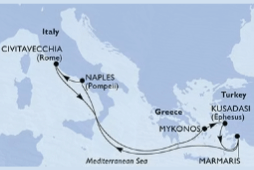 Set sail from Civitavecchia on a voyage filled with history, sunshine, and stunning Mediterranean scenery, where Italian charm meets the magic of the Aegean. Enjoy relaxing days at sea before wandering the whitewashed streets of Mykonos, uncovering ancient treasures in Kusadasi, and soaking up the coastal atmosphere of Marmaris. On your return to Italy, explore Naples and embrace la dolce vita with views of Mount Vesuvius, local flavours, and the laid-back luxury of the MSC Divina.