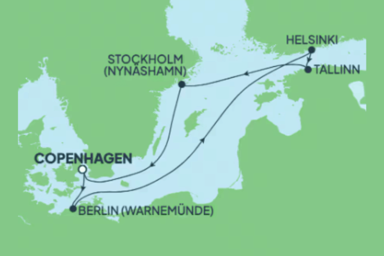 Ports of Call: Copenhagen, Denmark – Berlin (Warnemünde), Germany – Helsinki, Finland – Tallinn, Estonia – Stockholm (Nynashamn), Sweden – Copenhagen, Denmark – Plus two days At Sea.