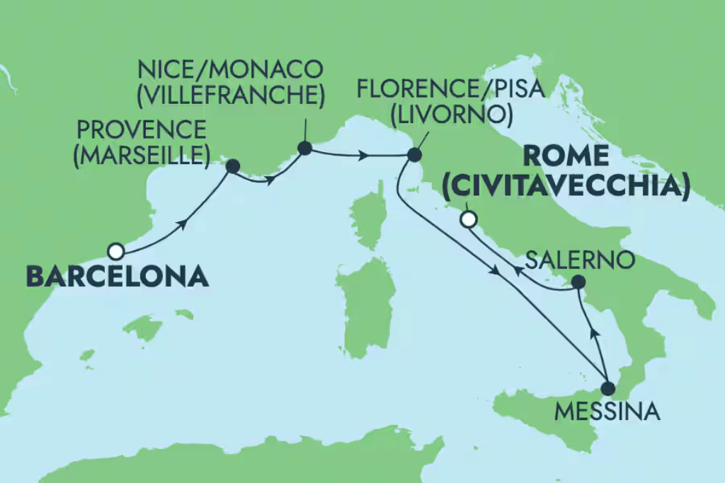 Fall in love with the dramatic landscapes and rich cultures of Europe. Lose yourself amongst the cobbled roads, colourful buildings, and incredible vistas in Villefranche-sur-Mer - a picturesque town situated along the French Riviera - or recline on one of the nearby idyllic beaches. Nestled on the west coast of Tuscany, charming Livorno offers the freshest seafood, awe-inspiring forts and splendid coastal views with ample cafes and boutiques that await your discovery. Then outside of Messina, you can step back in time with a visit to two enchanting medieval villages, Taormina and Castelmola, that are set upon dramatic cliffs overlooking the sea.
