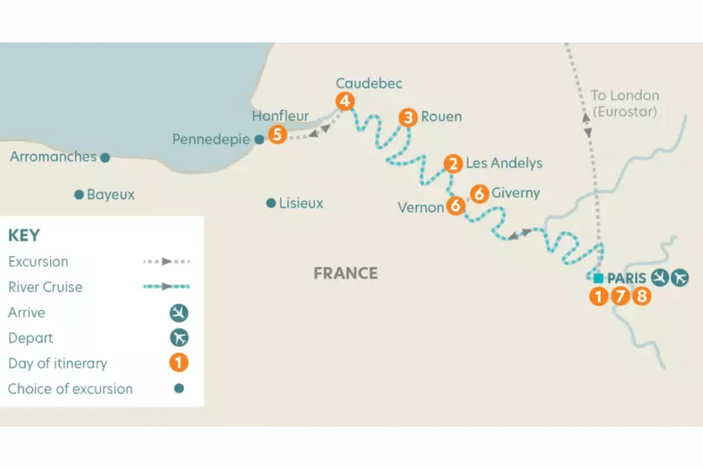 Sail from the heart of Paris on a graceful journey through France’s timeless beauty, where the romance of the city gives way to the charm of Normandy’s rolling countryside. Wander through Monet’s dreamy gardens in Giverny, explore medieval Rouen, and stand in reflection on the historic D-Day beaches, each stop revealing a new layer of French culture and history. Aboard your elegant river ship, indulge in fine cuisine, free-flowing drinks, and relaxed luxury as you drift along the Seine — an unforgettable blend of art, heritage, and serene river cruising.