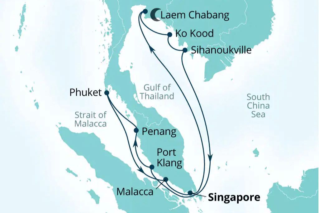 Singapore, Singapore -- Bangkok, Thailand -- Ko Kood, Thailand -- Sihanoukville, Cambodia -- Port Klang (Kuala Lumpur), Malaysia -- Penang, Malaysia -- Phuket, Thailand -- Malacaa, Malaysia -- Plus 5 days At Sea