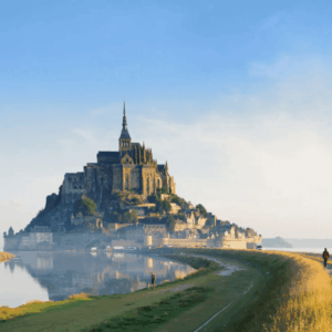 The towering monastery of Mont Saint Michel rises from the tidal flats, cut off twice a day by the sea. Ascend the spiral street to see the spare monastic chambers .