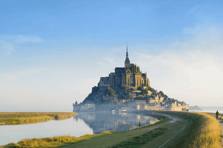 The towering monastery of Mont Saint Michel rises from the tidal flats, cut off twice a day by the sea. Ascend the spiral street to see the spare monastic chambers .